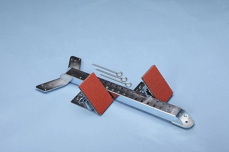 Blocco di partenza ambidestro a 2 blocchetti di acciaio zincato con superficie antiscivolo, regolabili in inclinazione e distanza su asta centrale di acciaio zincato a 14 posizioni.