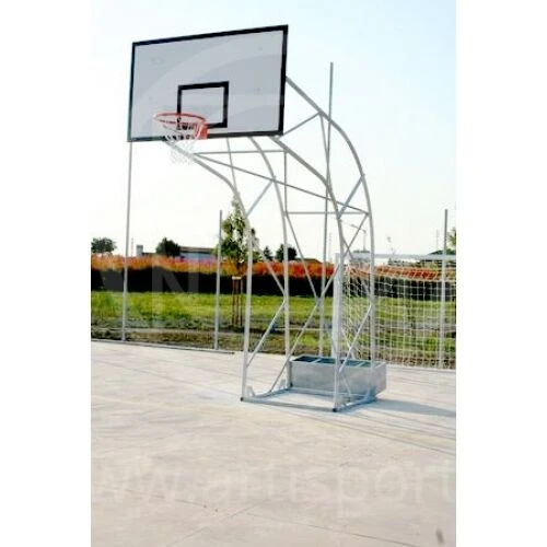 L’impianto viene fornito di: tabelloni resina melaminica spes. 10 mm, dim. 180×105 cm, canestri regolamentari rinforzati e retine.