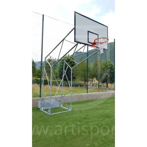 Coppia impianto basket olimpionico trasportabile costituito da tralicci portanti in acciaio zincato a caldo divisi in 2 pezzi in tubolare diam. 50 mm controventati con tubolari diam. 30 mm uniti tra loro a mezzo viti M10. Complete di dado e rondelle su piastre 50×8.