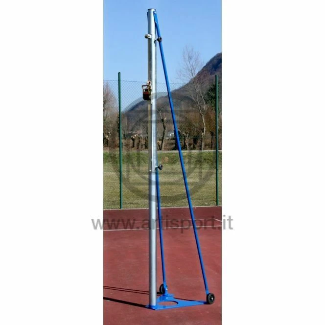 Coppia impianto pallavolo/volley modello Torneo costituito da n. 2 montanti principali in tubolare d’acciaio zincato diam. 70 cm., base a terra a T in piatto d’acciaio verniciato spessore mm. 10, tiranti in acciaio sezione mm 25 verniciati alle polveri epossidiche.