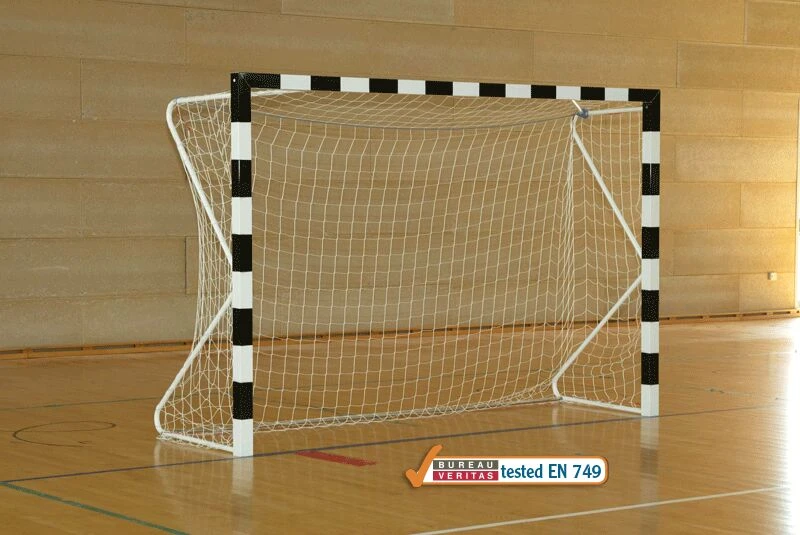 Coppia porte gioco pallamano trasportabili realizzate in profilato di alluminio verniciato (bianco-nero, bianco-rosso, bianco-blu) a sezione quadrata mm 80×80, rinforzato con nervature interne antiflessione.