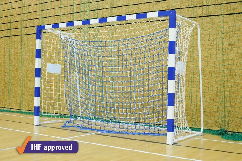 Coppia porte pallamano in alluminio, omologate IHF, reggirete reclinabili, dimensioni regolamentari cm 300×200, complete di reti con rete ammortizzatrice e accessori di fissaggio a terra.