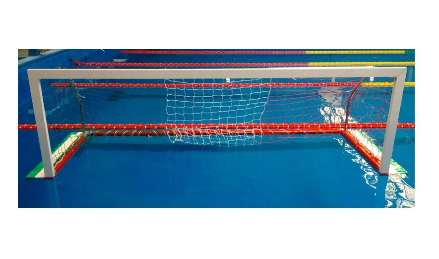 Coppia porte pallanuoto regolamentari in alluminio con base galleggiante e supporti reggirete posteriori.