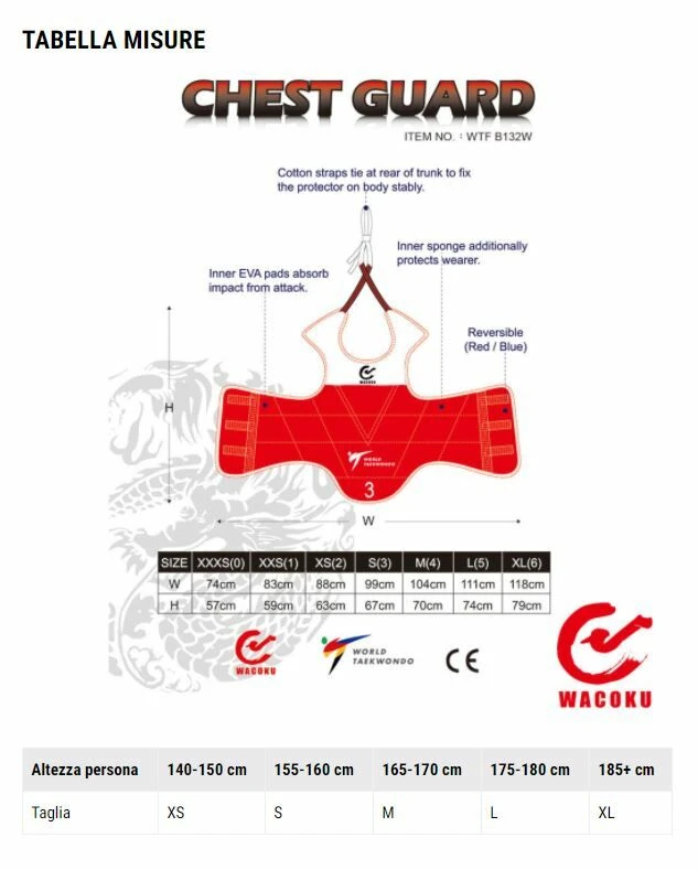 Corpetto approvato dalla WTF (World Taekwondo Federation). Protezione totale del tronco e delle spalle.
