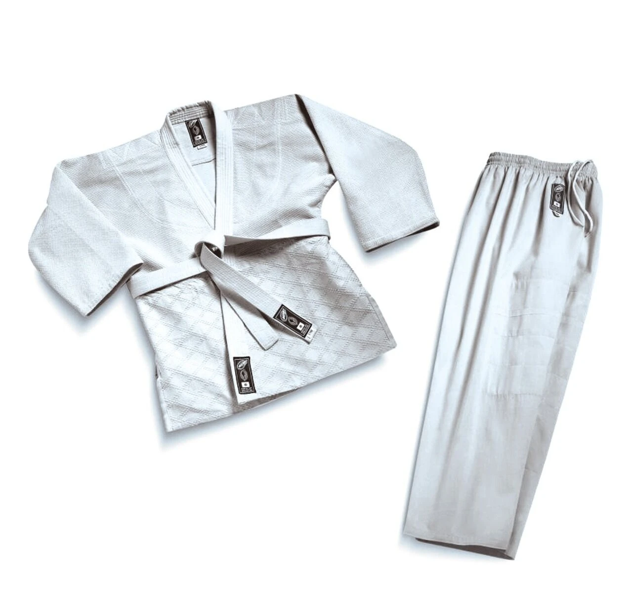 Judo-Gi scuola EFFEA SPORT in cotone al 100% prelavato con acqua di riso, di colore bianco. Ideale per chi desidera praticare Judo con la sicurezza di avere addosso un materiale di qualità che non si strappi.