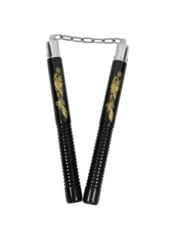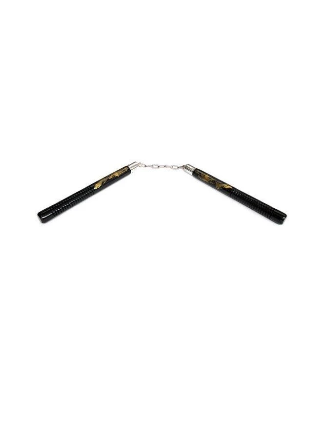 Nuchaku a sezione tonda in legno verniciato di colore nero. Kon uniti da catena e snodi.
