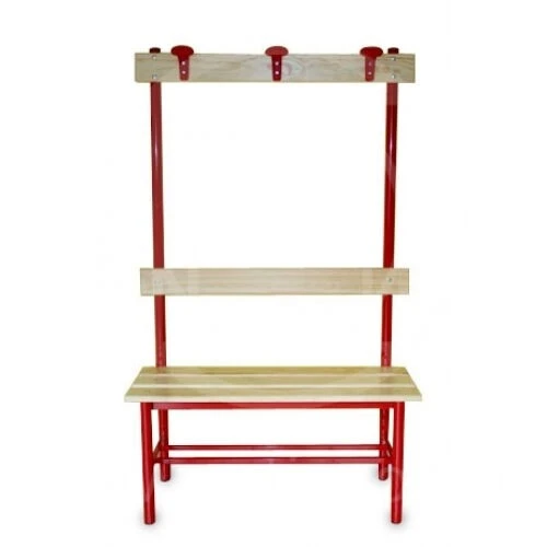 Seduta, schienale ed appendiabiti in doghe di pino arrotondate e verniciate al naturale, sezione mm. 100 x 20. 3 grucce in PVC stampato, completa di appoggi a terra in gomma antiscivolo.