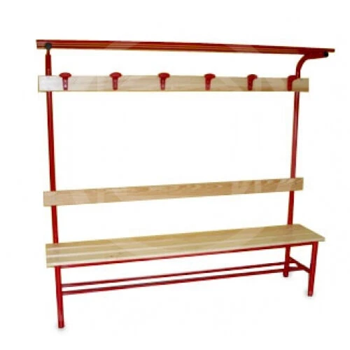 Panca completa per spogliatoio composta da seduta con schienale, appendiabiti, soprastante cappelliera e ripiano porta scarpe sul fondo.