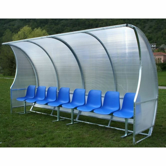 Panca per bordo campo da calcio modulare e componibile, ampliabile in ogni momento con copertura in policarbonato alveolare mm 6 e protezione anti UV, tamponamento inferiore con pannelli in resina melaminica spessore mm 4.
