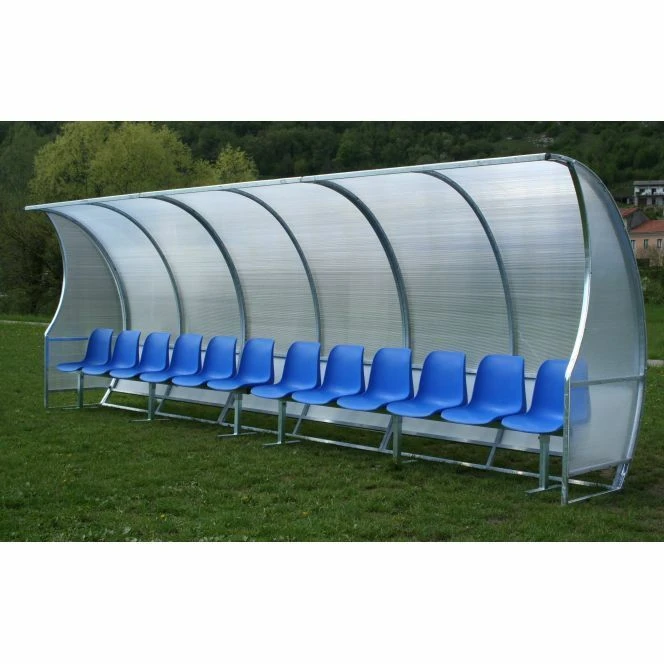 Panca per stadi e campi da calcio copertura in policarbonato alveolare mm 6 e protezione anti UV, tamponamento inferiore con pannelli in resina melaminica spessore mm 4.