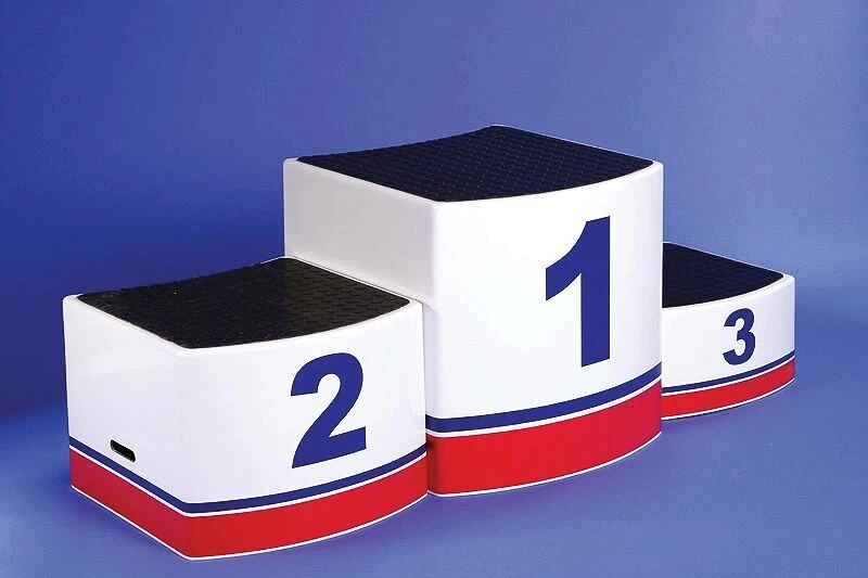 Podio per vincitori composto da 3 moduli indipendenti in vetroresina, sezione rotonda con superficie antiscivolo.