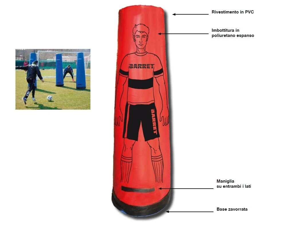 Sagoma in gommapiuma, rivestimento in PVC con decorazione digitale fronte-retro del giocatore, zavorrata alla base con sabbia.