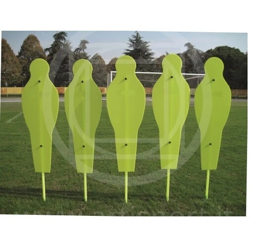 Set di 5 sagome munite di 1 puntale metallico da fissare solo nel terreno uso barriera e slalom, altezza regolabile da 150 cm a 190 cm.