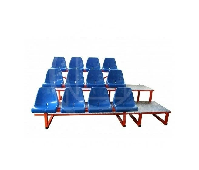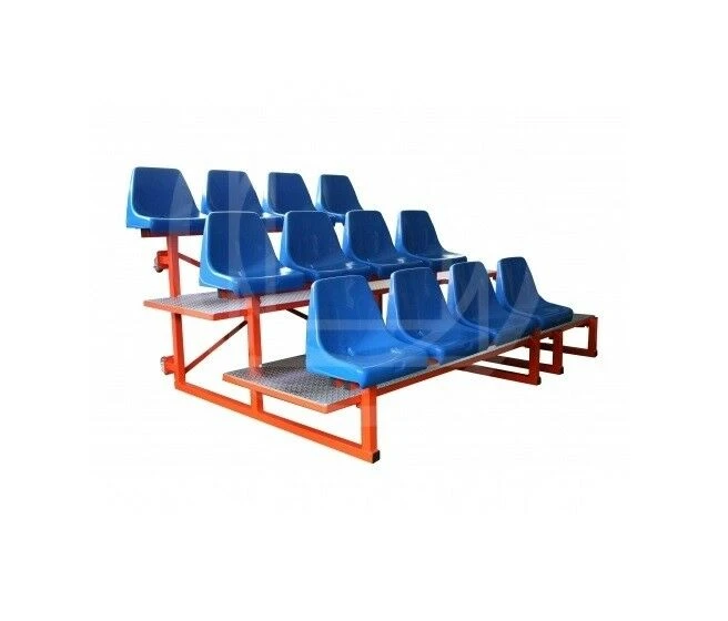 Modulo tribunetta da m 2 disposta su tre file, seduta in scocca di polipropilene con schienale ignifughe cl 1, piani di calpestio in multistrato o in lamiera antiscivolo.