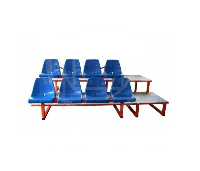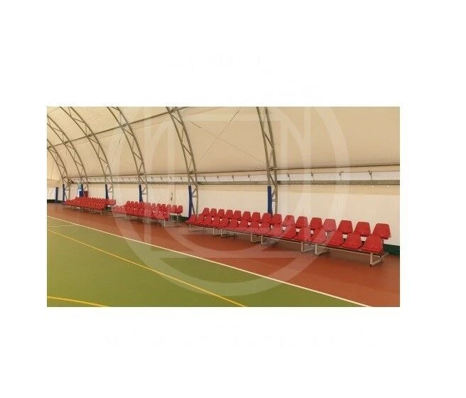 Modulo tribuna da m 2 disposta su 2 file, seduta in scocca di polipropilene con schienale ignifughe cl 1, piani di calpestio in multistrato o in lamiera antiscivolo.